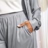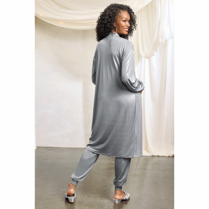 This active set is the perfect blend of casual comfort and shimmery elegance, crafted in stretch knit lamé embellished with shiny metal studs. The open-front jacket features a Mandarin collar, drop shoulders and long cuffed sleeves. It’s paired with embellished jogger-style pants with a comfortable elastic waistband, side pockets, ankle cuffs and 29" inseam. Love a relaxed-yet-refined vibe? Then you will love rocking this set!